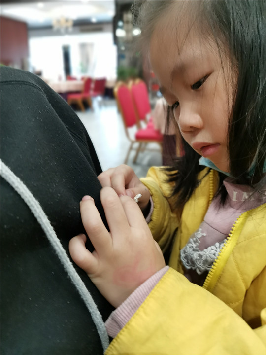 早上出去饮茶的时候,表弟的宝贝女儿在专心地给我上扣针,被我偷拍了一张!