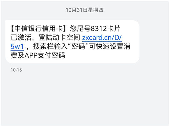 到了28号就收到了中信的实体信用卡,这下子拿着实体卡和身份证去网点激活基本就没跑了!