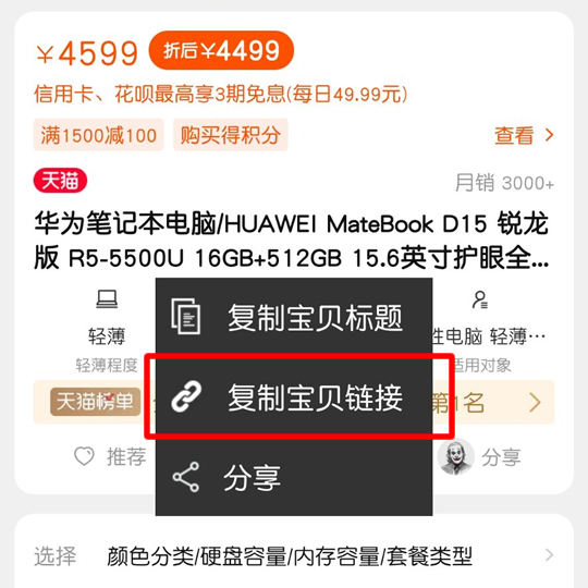3、手指按定商品标题1秒,然后在弹出框里选择“复制宝贝链接”;