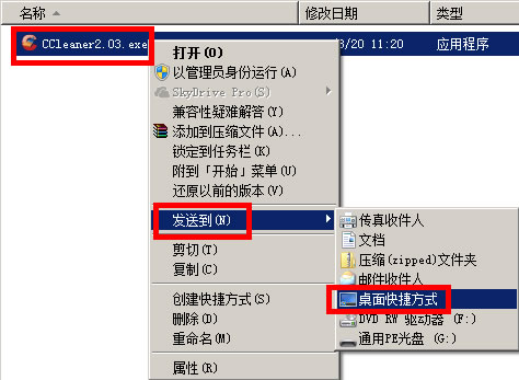 1、鼠标右键单击“CCleaner2.03.exe”,选择“发送到(N)”,点击“桌面快捷方式”;