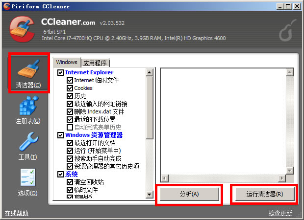 2、点击左侧的“清洁器(C)”,然后点击“分析(A)”,等分析完毕之后,点击“运行清洁器(R)”即可;