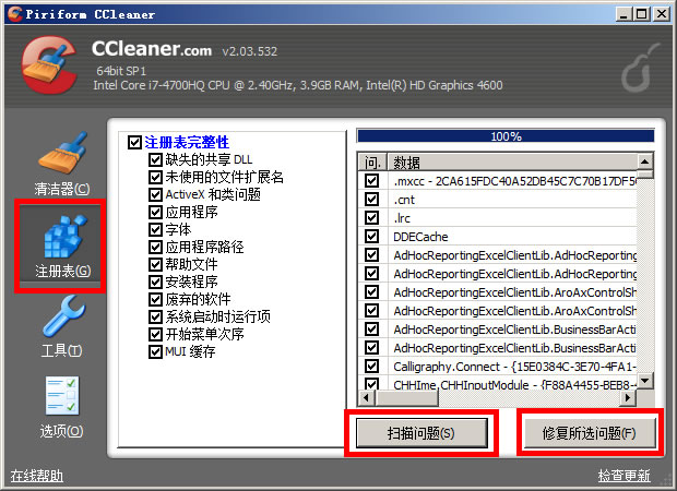 3、点击左侧的“注册表(G)”,然后点击“扫描问题(S)”,扫描完毕之后点击“修复所选问题(F)”;