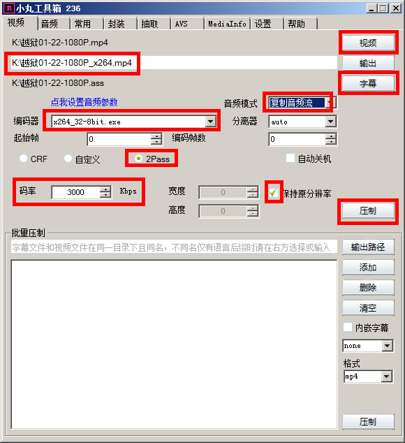 8、打开程序,点击“视频”添加视频文件,点击“字幕”添加字幕文件,在“输出”一项设置封装后的路径,音频模式选择“复制音频流”,编码器选择“x264_32-8bit.exe”或“x264_64-8bit.exe”,勾选“2Pass”设置“码率”参数,勾选“保持分辨率”,最后点击“压制”即可!