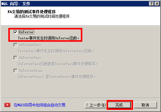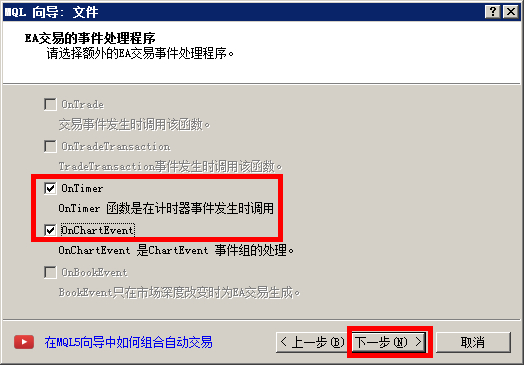 7、勾选择“OnTimer”和“OnChartEvent”,点击“下一步(N)”: