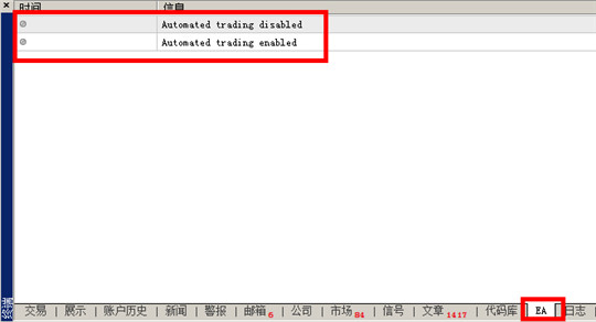 7、在MT4顶部的“显示(V)”里打开“终端”(T),点击下方的“EA”,即可查看脚本的运行状态:
