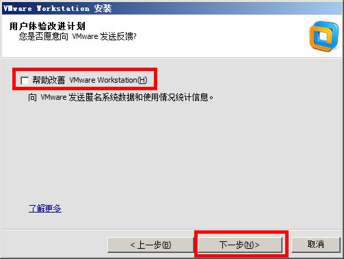 11、取消勾选“帮助改善 VMware Workstation(H)”然后点击“下一步(N)”;