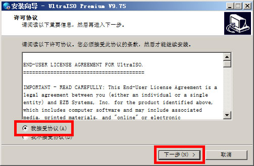 1、运行安装程序,选择“我接受协议(A)”,点击“下一步(N)”;