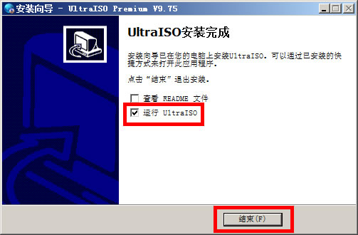 6、勾选“运行UltraISO”,点击“结束(F)”;