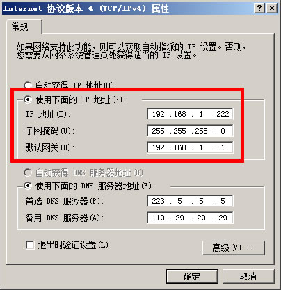 04、点击“使用下面的 IP 地址(S)”,将“IP 地址(I)”、“子网掩码(U)”、“默认网站(D)”按照下图设置,要注意的是IP地址中的222可以自行设置,其它则是固定不变的;