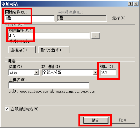 15、无论是内网还是外网,默认端口都是80,因为是默认的,所以不需要在地址里添加,但如果本地电脑有多个网站环境,可以用不同的端口区分,如下图所示,我新建了一个路径为J盘、端口为203的网站,如果此时在J盘有一个01.mp4的视频文件,那么内网地址则应该是“http://192.168.1.222:203/01.mp4”!